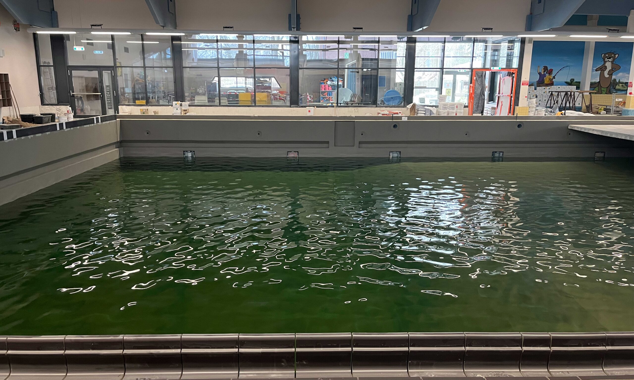 Das Lehrschwimmbecken ist bereits fertig abgedichtet und gefliest. Die Probefüllung erfolgte über die Weihnachtsfeiertage und verlief positiv. Die Verrohrung im Keller und die Anschlüsse der Einbauteile in diesem Bereich ist abgeschlossen. Die Abdichtungsarbeiten am großen Becken wurden Anfang Februar abgeschlossen und im Anschluss das Becken gefüllt um auch hier die Abdichtung zu prüfen. Aktuell wurde das Wasser hier wieder abgelassen und das Becken trocknet. Während der Probefüllung wurden bereits erste Fliesenarbeiten im Beckenumgang begonnen.